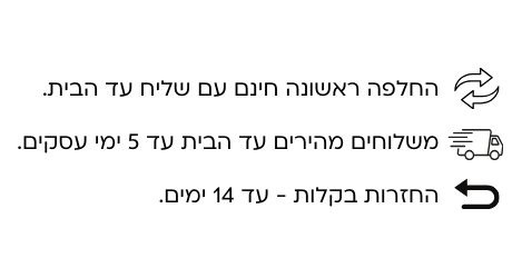 • המשלוח יגיע תוך 1-5 ימי עסקים ולא כולל את יום קליטת ההזמנה.